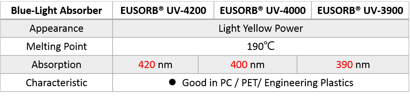 「藍光吸收劑」是一種淡黃色的粉末狀商品,廣泛添加於各種塑膠中,來滿足3C 產業或任何其他產品對消除藍光的需求。藍光吸收劑能吸收掉可見光光譜中的短波長高能量的光(HEV光),吸收波長約為380nm~430nm,故也被稱為藍色阻斷劑。